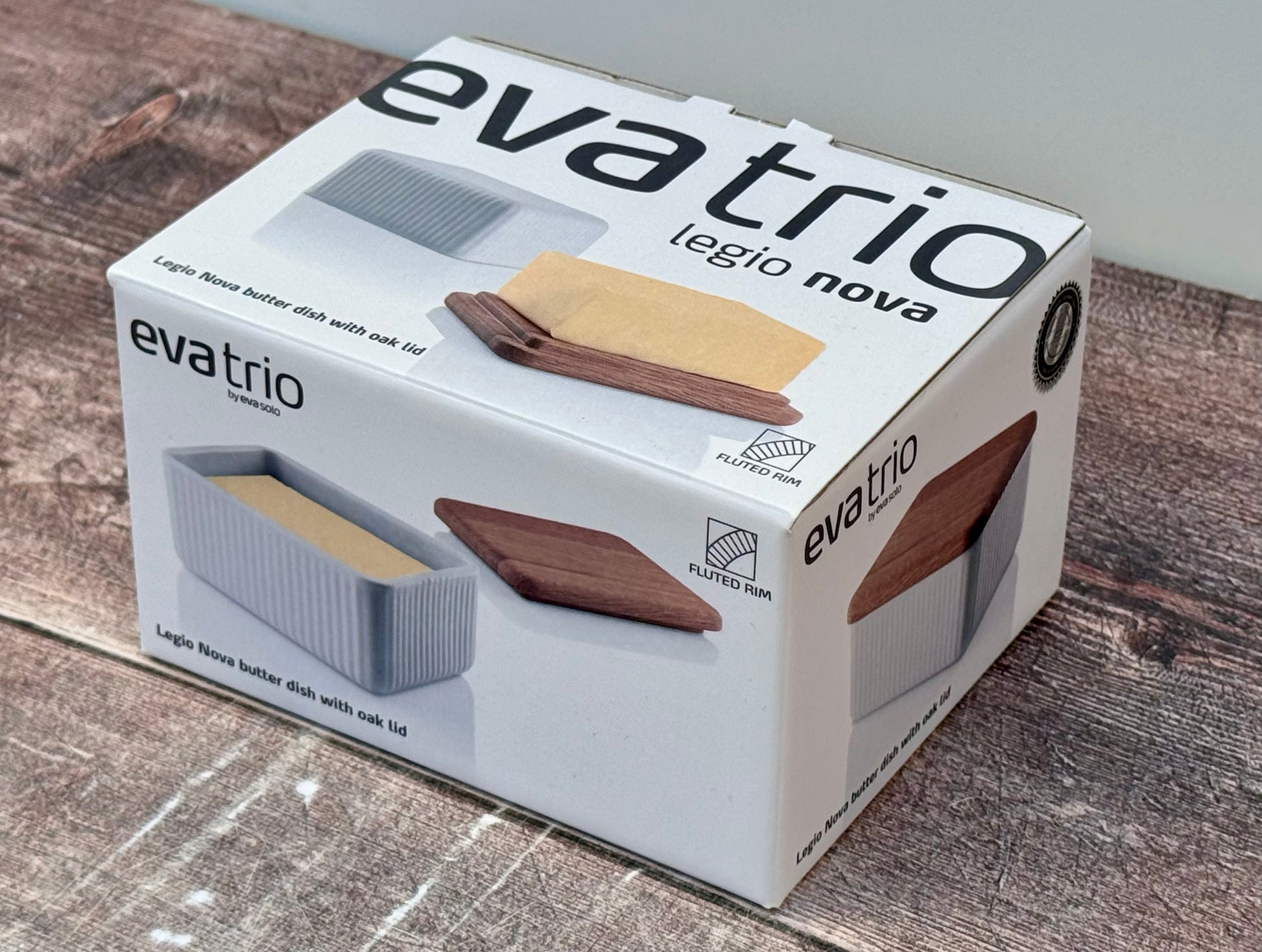 A white porcelain butter dish, with an oak lid. This will fit a standard packet of butter.
