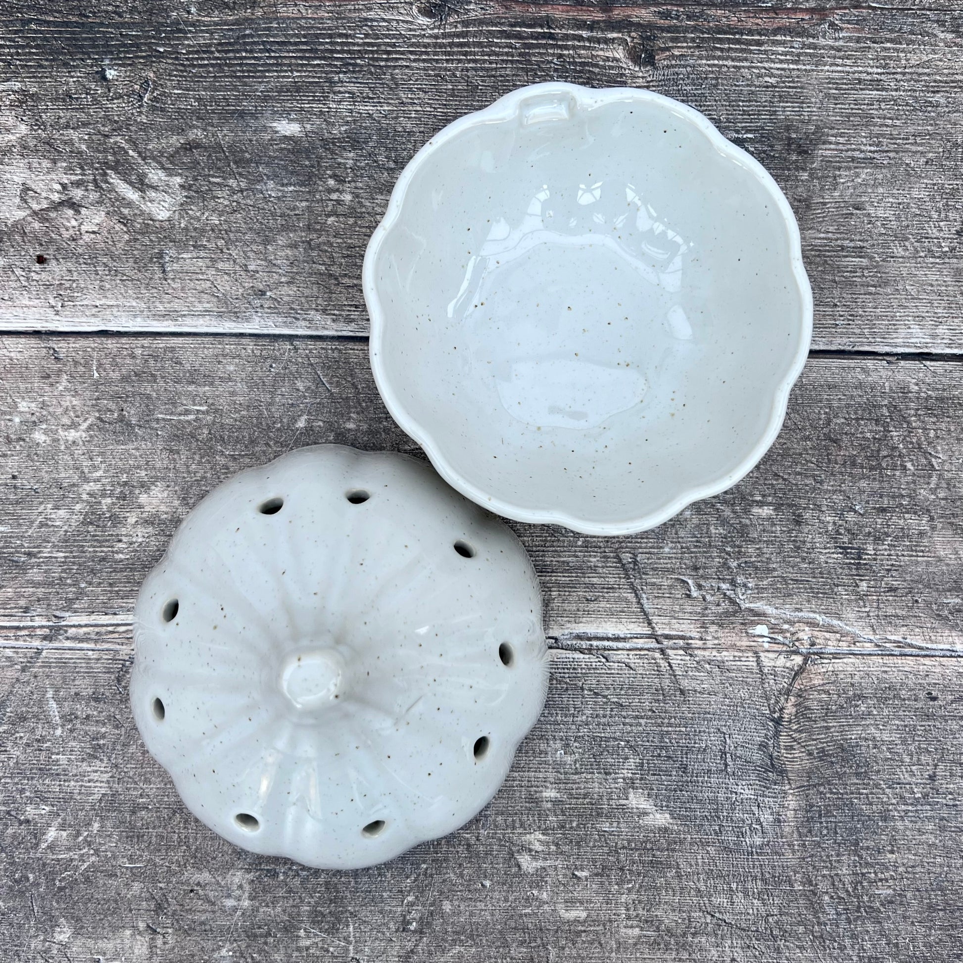 A simple white garlic canister with a rough cream base to add a touch of detail.