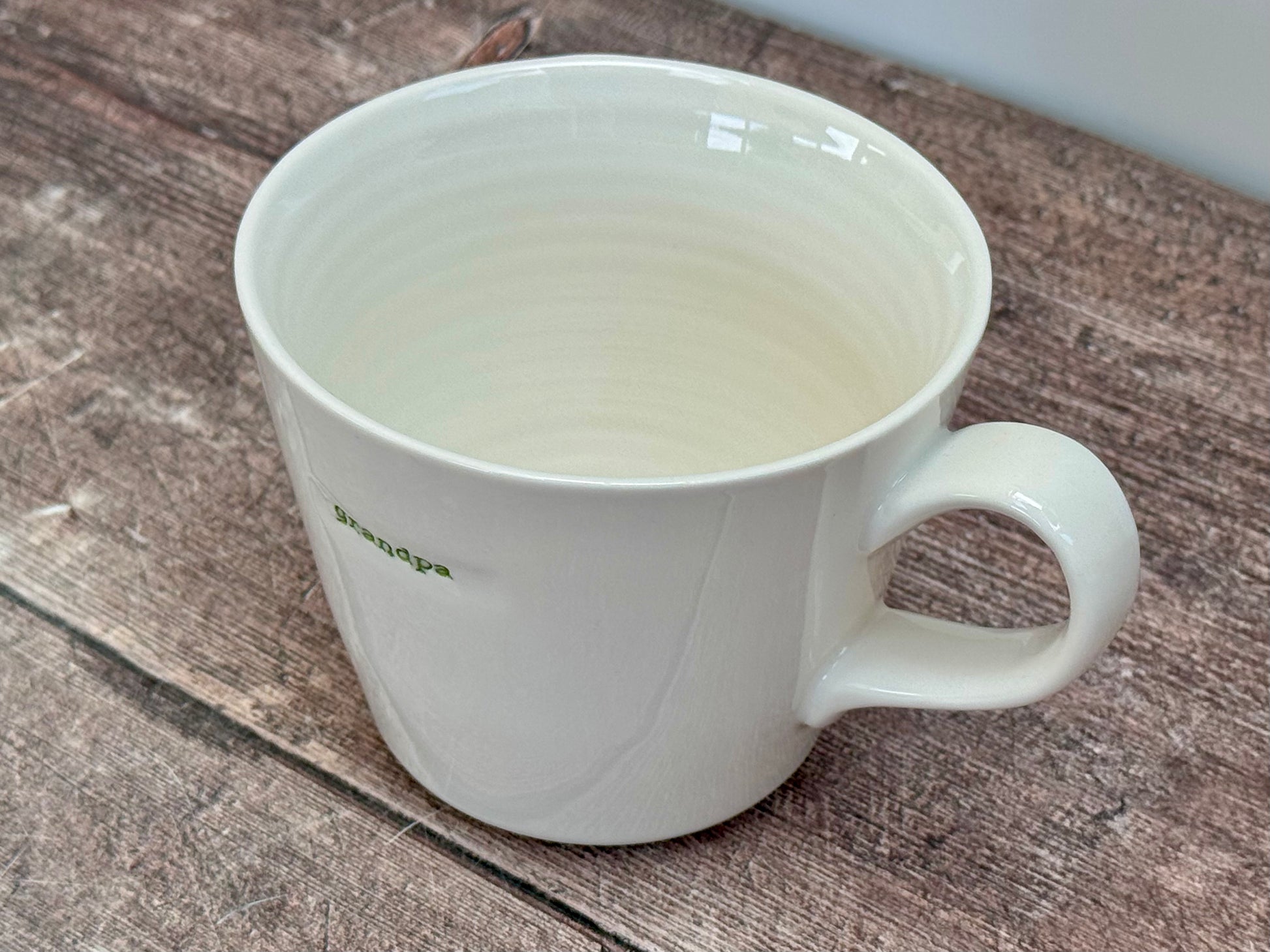 A white mug with ‘grandpa’ written in green on one side.