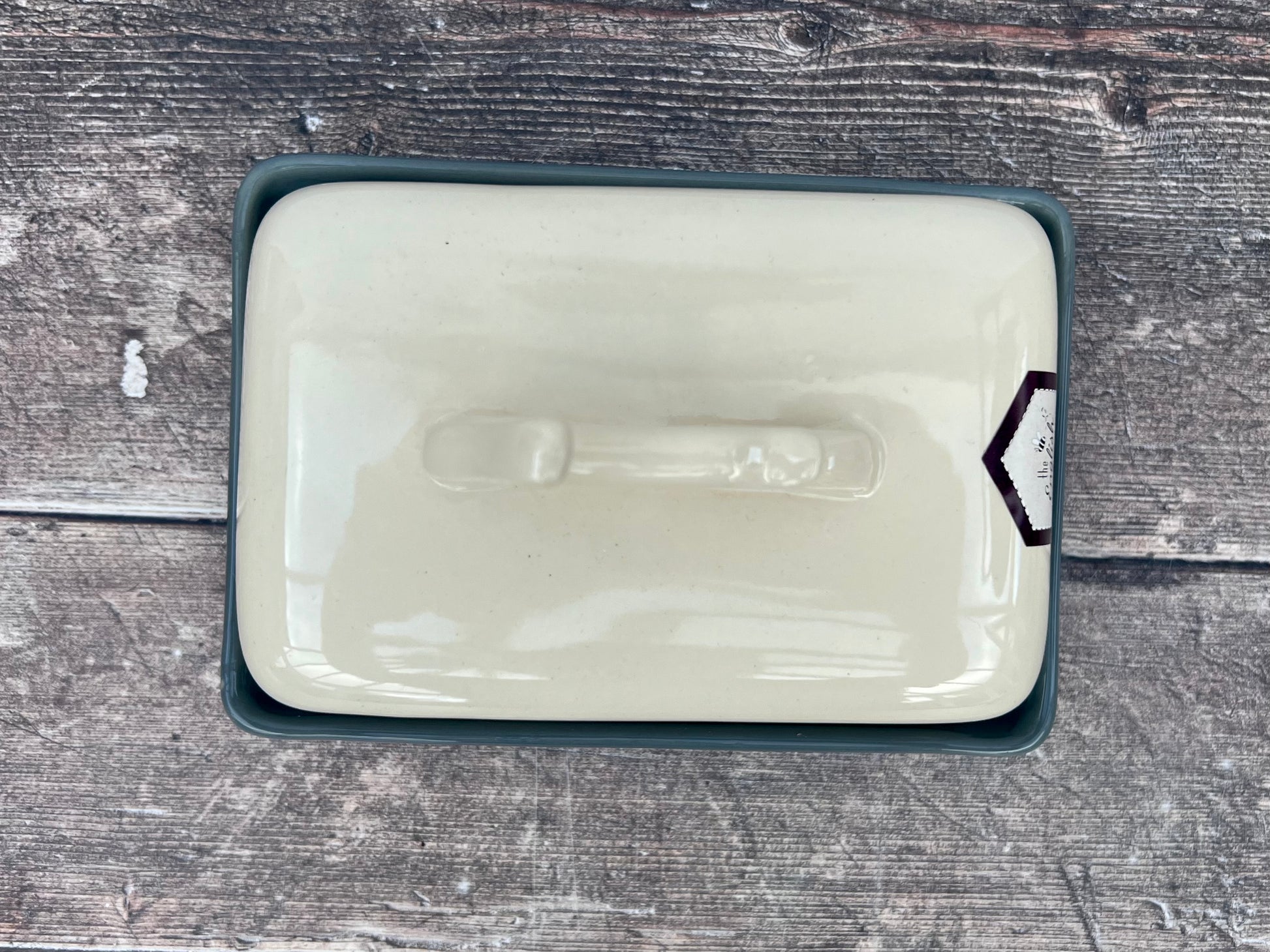 A white butter dish with a grey hare design on both sides, with a grey base.