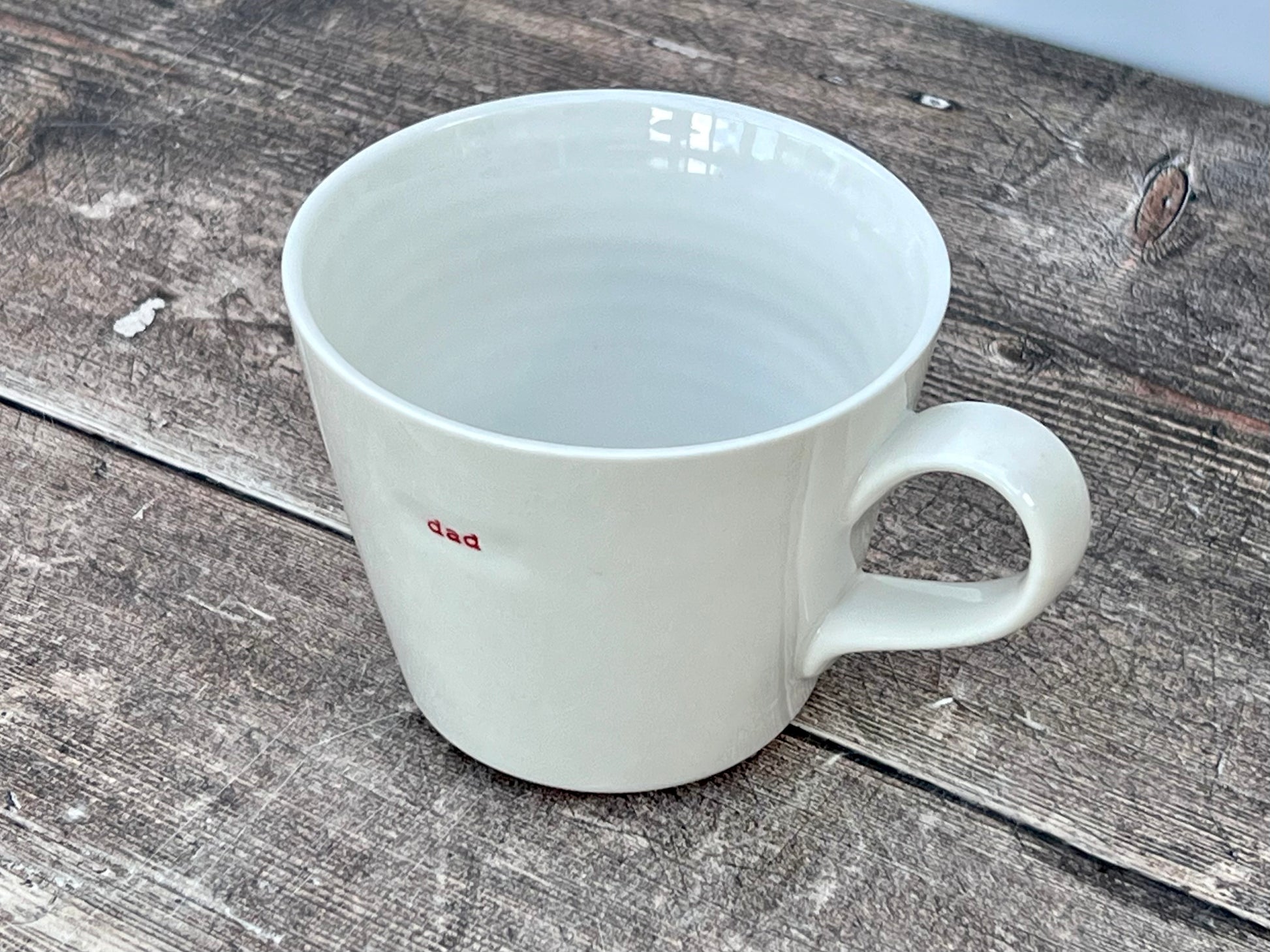 A white mug with ‘dad’ written in red on one side.