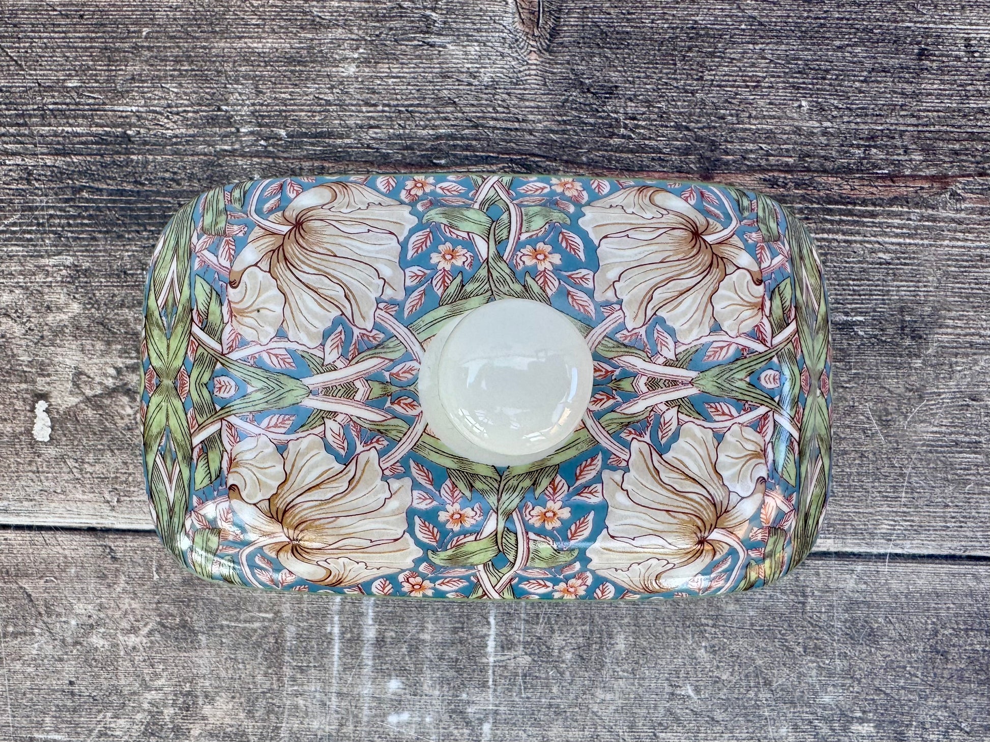 From William Morris, this Pimpernel butter dish contains a blue, green and cream floral pattern.