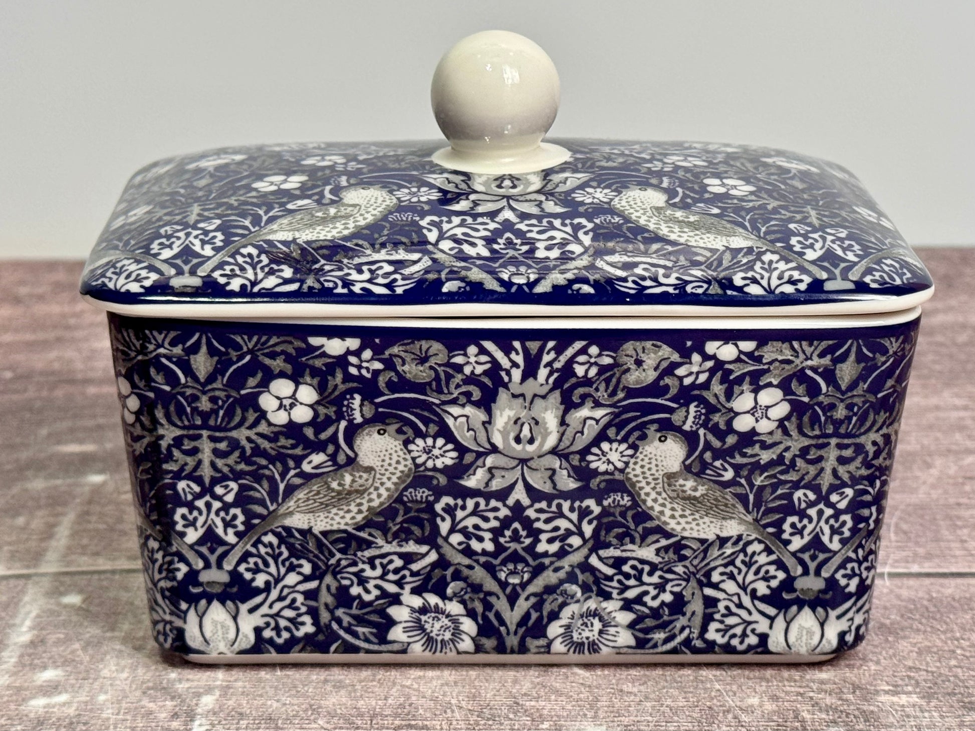 From William Morris, this strawberry thief butter dish contains a blue floral pattern.
